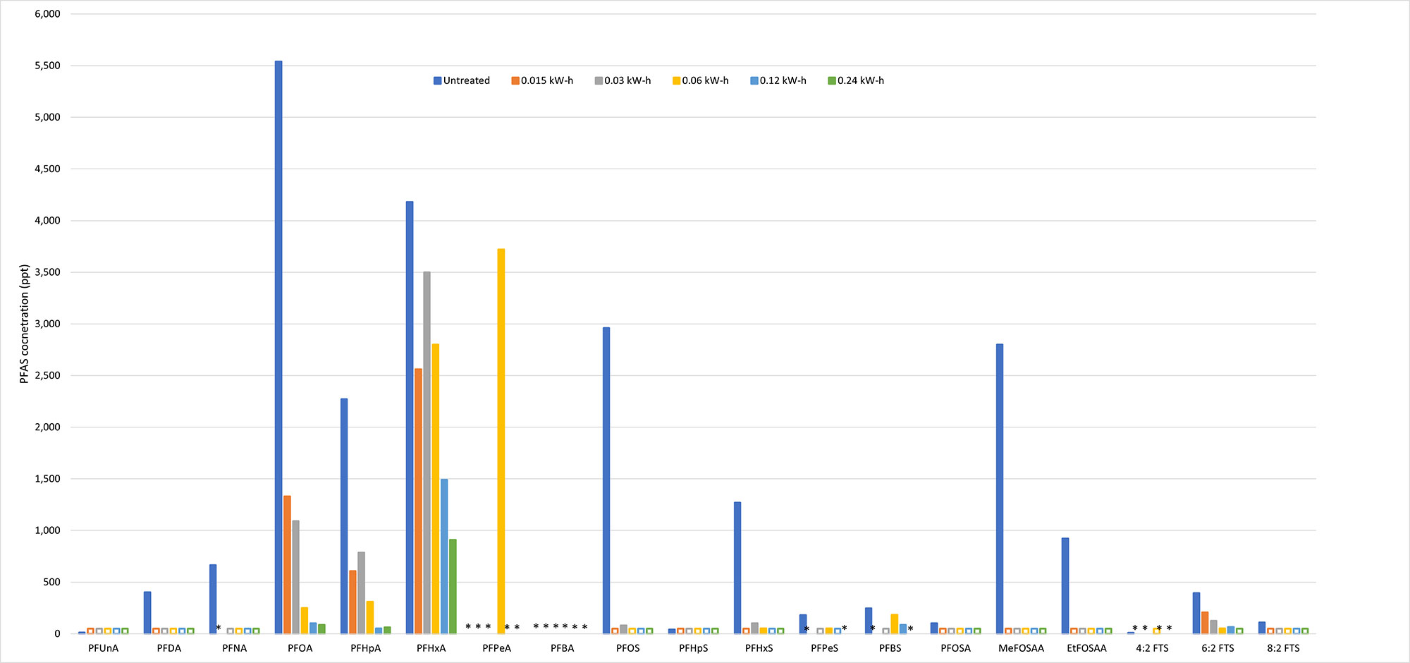 - Intermediate increases in perfluorinated carboxylic acid concentrations over time illustrate the systematic disassembly of the PFAS carbon chain one C-F group at a time. Those intermediate increases in PFAS concentrations subsequently decrease as the shorter chains are also disassembled.